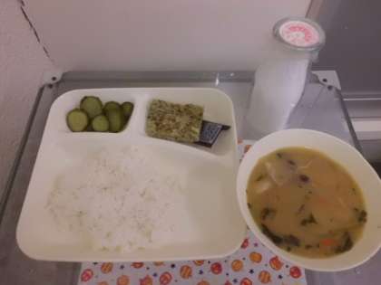 10月30日(月)の給食はお好み焼き、豚汁、きゅうりの梅風味、ご飯、牛乳です。