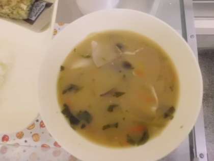 学校のお好み焼きは四角です。少し薄めですが、柔らかくておいしいです。豚汁は具だくさんみそ汁になっていて、栄養価の高い一品です。