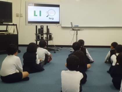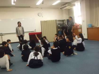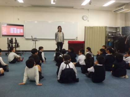 11月2日(木)の5時限目、多目的室で1年1組学級活動(英語活動)の研究授業を行いました。学級担任、栄養教諭の二人の指導で、食材を使ってゲーム形式で授業をすすめていきました。他の学校からもおおぜい参観にこられていました。