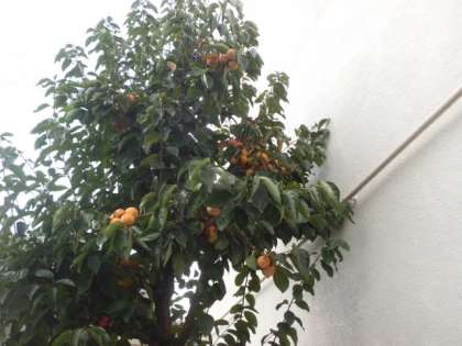 校舎南西角の学習園のところにある柿の木に実がたくさんなっています。渋柿ですので、鳥は食べに来ません。ただし、完全に熟すと甘みが出て、時おり、ついばんでいることもあります。