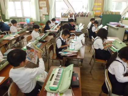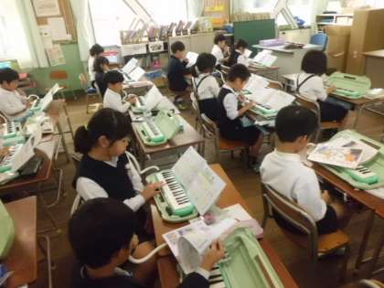 1年1組音楽の学習の様子です。鍵盤ハーモニカを使っています。