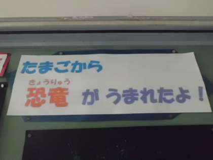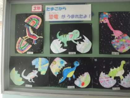 11月8日(水)玄関入って右手の掲示物です。3年生の作品が展示されています。「たまごから恐竜がうまれたよ!」です。来校された時にご覧ください。