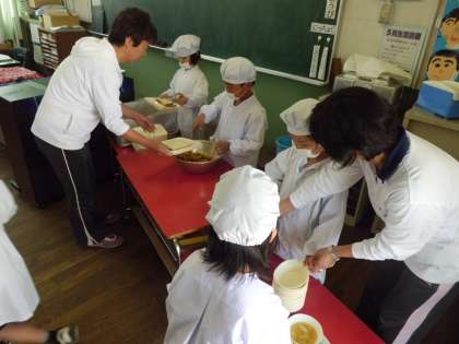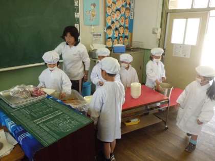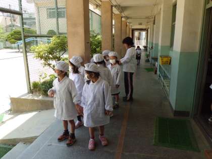 1年生の給食の準備は今までは6年生が手伝っていましたが、今日から先生の補助のもと自分たちでしました。おかずや食器、牛乳など二人一組で頑張って教室まで運んだあと、食器におかずを入れる係り、パン皿を配る係りなど手分けして準備していました。だんだんと慣れてくることだと思います。