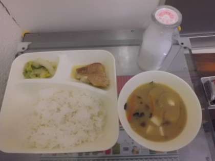 11月20日(月)の給食は赤魚のしょうゆだれかけ、なめこのみそ汁、はくさいのごまあえ、ご飯、牛乳です。