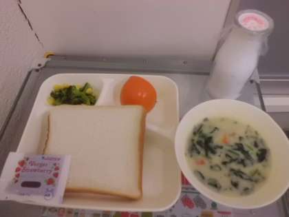 今日の給食はほたて貝のクリームシチュー、ブロッコリーとコーンのサラダ、かき、パン、イチゴジャム、牛乳です。今日の給食の柿は「富有柿」という代表的な甘柿です。柿がたくさんとれるのは、1位和歌山県、2位は奈良県、3位は福岡県です。富有柿などの甘柿は暖かい気候を好み、寒すぎると甘い柿になりません。