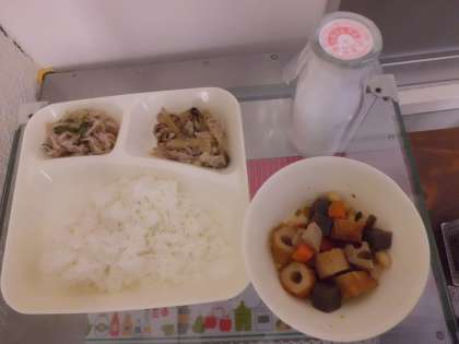 11月27日(月)の給食は豚肉のごまだれ焼き、大豆の煮もの、切り干しだいこんのしそ甘酢づけ、ご飯、牛乳です。今日の給食のメニューは学校給食献立コンクール最優秀作品です。食物繊維たっぷりの切り干しダイコン、きのこ、大豆、れんこん、ごまなどを使っておなかの中をすっきりさせる健康メニューを考えたそうです。