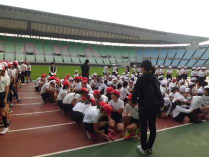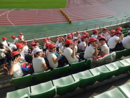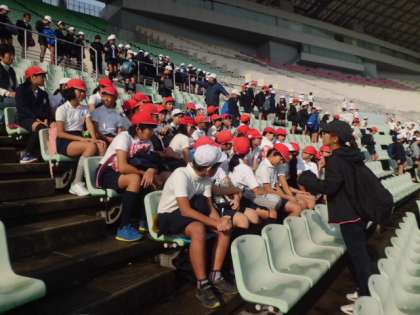11月15日(水)に6年生が長居陸上競技場で生野区の学校7校の児童ととともにスポーツ交歓会に参加しました。午前中が長居のメインスタジアムで100m走(全員)と4×100mリレーを行い、午後から長居の第2スタジアムで天然芝でのサッカー、ドッジボール、大縄跳びを行いました。当日は天候に恵まれ、暖かく運動するにはちょうどよい気候となりました。他校の児童との交流もあり、楽しく運動に親しむことができました。