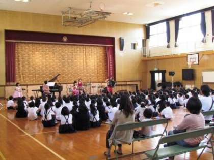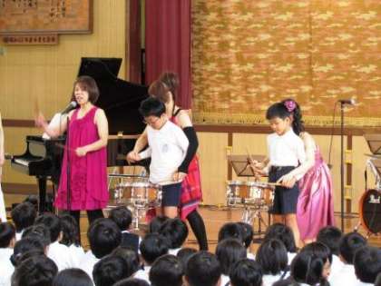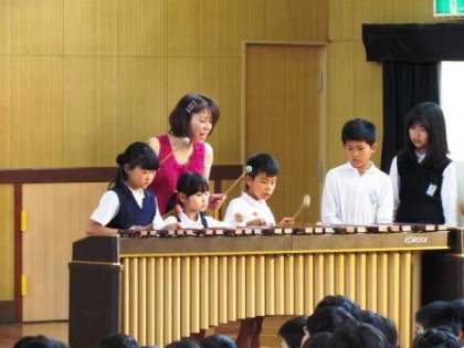 5月10日に土曜授業として、音楽鑑賞会を行いました。すばらしい歌声やいろいろな楽器のアンサンブルに夢中になり、あっという間に1時間が過ぎました。体験コーナーでは、代表の子どもたちが、アコーディオン、マリンバ、ギロ、クラベス等の楽器と使って演奏に挑戦。鑑賞に来てくださった保護者の方たちの手拍子の応援をうけて、しっかりと演奏することができました。最後は、台所用品を使っての楽しい演奏会。音を出す楽しさに触れることができ、音楽が好きになった子どもも増えたのではないでしょうか。