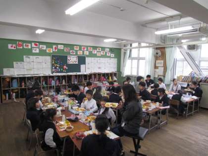 11月21日(火)毎年この時期に交流給食を実施しています。交流給食はクラスの半分の子どもたちが別の学年の教室に行き、異学年同士で給食を食べ、交流を深めるというものです。短い時間ですが、グループになって楽しくいただきました。教職員も各クラスにわかれて入り、一緒に給食を食べました。