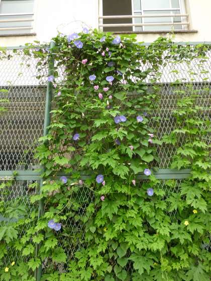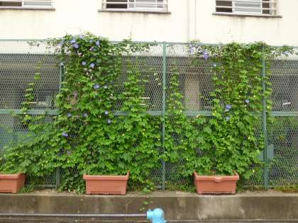 西校舎前の防球ネットにのところにアサガオがかわいい花をつけています。琉球アサガオという種類です。また、プランタに植えられたゴーヤー(にがうり)もつるをのばし始めています。これらは緑のカーテンといってつるをのばす植物を植えることで夏の暑さをやわらげる効果があるとされています。見るだけでも涼しさを感じさせます。来週の参観で学校に来られた時にご覧ください。(上2枚が琉球アサガオ、下2枚がゴーヤーと全体の写真です)6月21日
