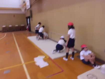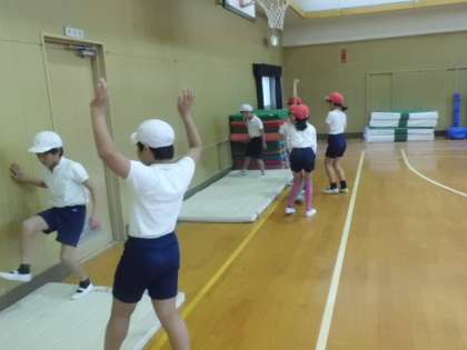 12月5日(火)4年生が体育館でマット運動をしていました。腕支持による倒立です。逆さになるため、慣れていない子どもには少し恐怖感があり、どうしても顎を引きぎみです。顎を引いてしまうと、前に回ってしまいます。手をついた時に思い切って前の方を見ると案外簡単にできることがあります。