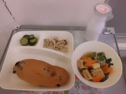 12月22日(金)の給食は中華煮、れんこんのオイスターソース焼き、きゅうりの辛みづけ、レーズンパン、牛乳です。中華煮は四角のあつあげが入っていて、ボリュームがありました。れんこんはしゃきしゃきした食感が残っており、オイスターソースの味わいでおいしかった。
