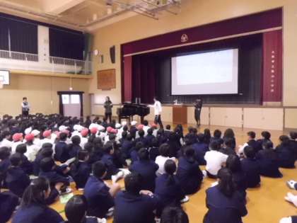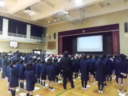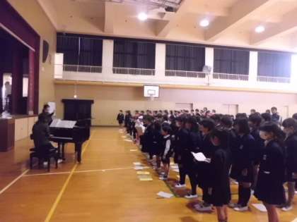 1月13日(土)に開催する、90周年記念式典の第2部で行う、ミニコンサートの全校児童での練習が始まっています。今日は、歌の練習です。講堂に伸びやかで美しい声を響かせていました。全校で練習する日は、限られていますが、精一杯取り組んでいます。