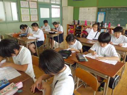 5年生は、初めて学習する家庭科で、裁縫の練習をしています。玉結び・玉どめ・なみ縫い・本返し縫い・半返し縫いなど縫物の基本を練習しています。「先生、針から糸が抜けました。」「糸が短くて玉どめができません。」など慣れない手つきで悪戦苦闘しています。ご家庭でお子様と一緒に裁縫をしてみてはいかがでしょうか?