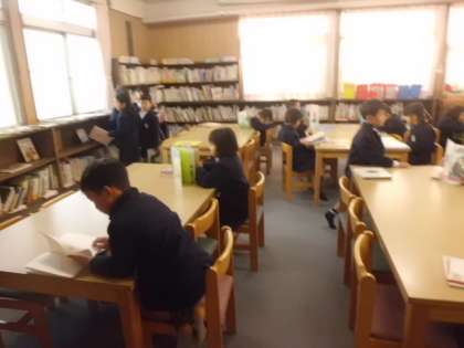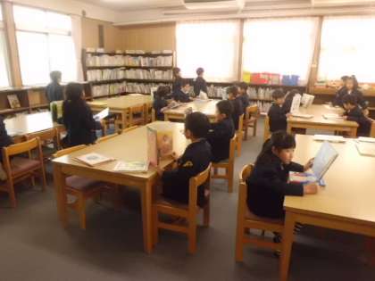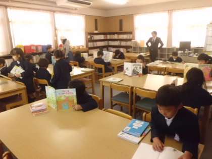 12月19日(火)1年2組の図書の時間です。静かに本を借りて読んでいます。最後には、今日、来ている図書館補助員の先生に絵本の読み聞かせをしてもらいました。今日の絵本は「とのさまサンタ」です。