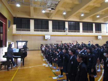 12月21日(木)の児童集会の様子です。今日も1月13日に行われる90周年の式典、2部でのミニコンサートに向けての練習をしました。だんだんと歌い方がよくなってきて、全員での美しい合唱になってきています。1月13日(土)の式典は10時からです。是非お越しください。
