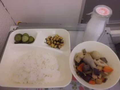 ひじき豆は少し固めですが、おいしかったです。きゅうりはほんのりと梅の風味がしていました。