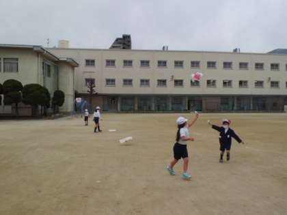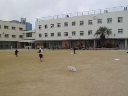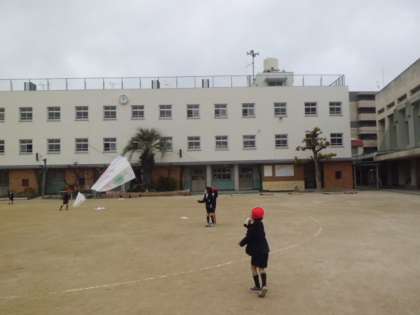1月22日(月)1年1組が運動場で手作りのたこあげをしていました。風があまり吹いていないので、頑張って走りました。