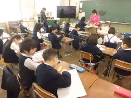 1月31日(水)2年図画工作の授業の様子です。1組、2組とも同じ題材のところを学習してます。