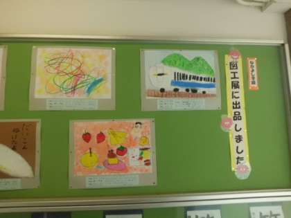 北校舎東の掲示板になかよし学級在席の子どもたちの作品が掲示されています。図工展に出品したものです。来校された時にご覧ください。