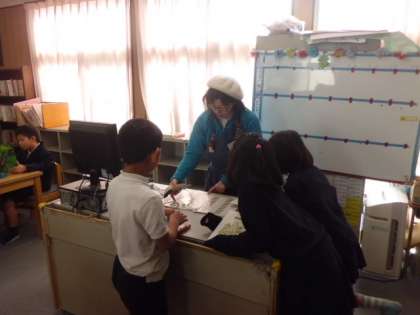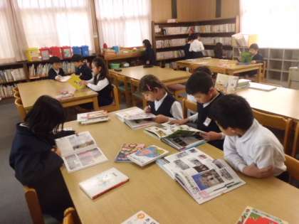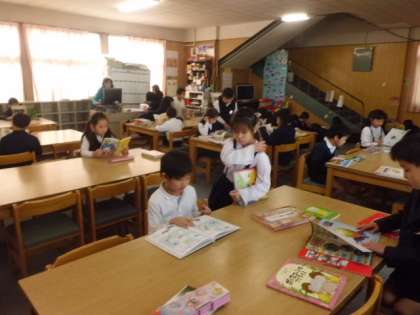 2年2組、図書の時間の様子です。図書補助員がパソコンを使って、本の貸し出しをしていきます。読みたい本を探すのに時間がかかる子どもいるようです。