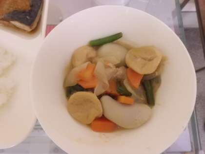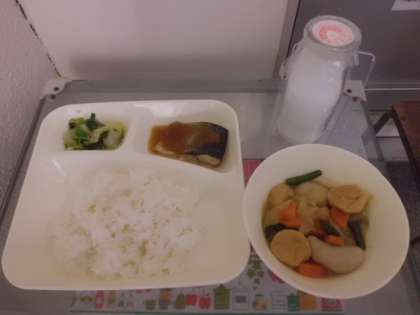 3月2日(金)の給食はさばのおろしじょうゆかけ、一口がんもとさといものみそ煮、はくさいのごまあえ、ご飯、牛乳です。