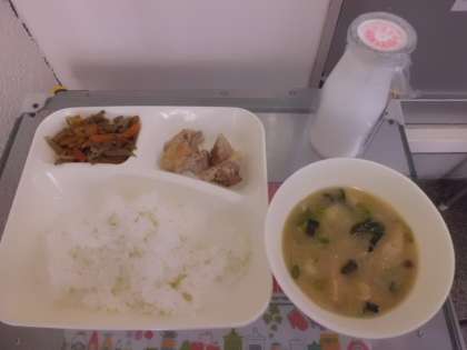 3月14日(水)の給食は鶏肉のしょうゆバター焼き、みそ汁、きんぴらごぼう、ご飯、牛乳です。鶏肉のしょうゆバター焼きは、ご飯にあうおかずとなっていました。学校のみそ汁はいつもぐだくさんです。