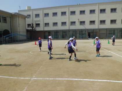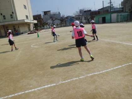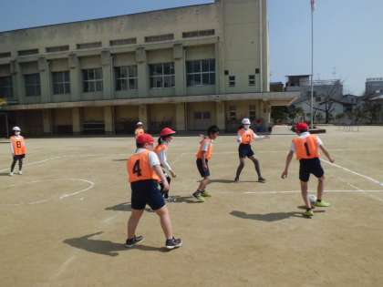 4年生の体育学習の様子です。ビブス(ゼッケン)を着用して、グループごとに練習をしています。