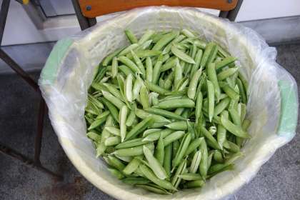 今日の「えんどうの卵とじ」のえんどうは給食室でさやから豆を取り出して調理しています。(下の写真は「さや」です。)