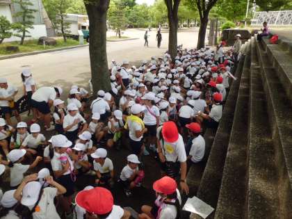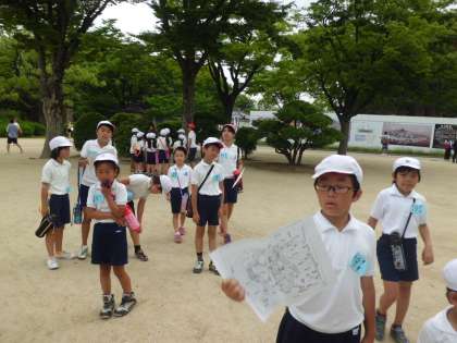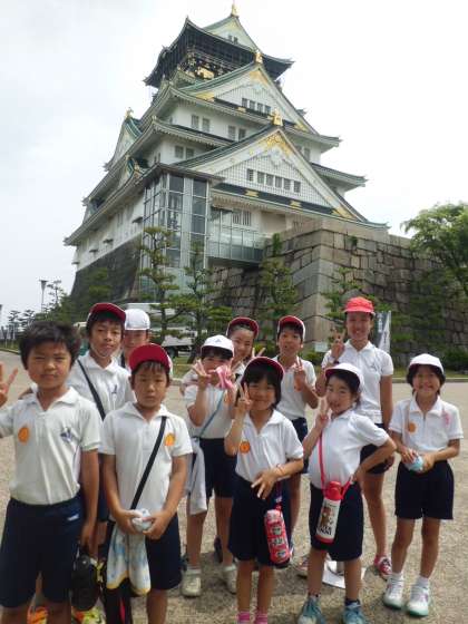 6月10日(火)全校児童、縦割りグループ(20)で大阪城公園へ全校遠足に行きました。ときおり日がさす天候の曇り空でしたが、厳しい暑さではありませんでした。大阪城公園内に設けた7つのポイントをグループで回りながら歩きます。各ポイントでは先生がいて、いろいろなゲームを子どもが楽しみます。12時からグループごとにお弁当を食べ広場で楽しい時間を過ごしました。