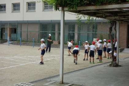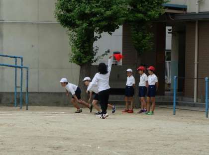 運動場では50m走、立ち幅跳び、ソフトボール投げの測定をしています。