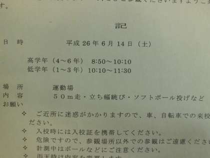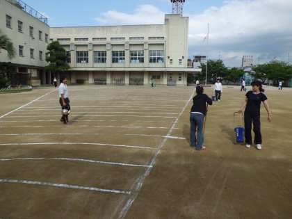 保護者の皆様には、プリントでお知らせしていますが、明日6月14日に土曜授業を実施します。スポーツテスト(50m走、ソフトボール投げ、立ち幅跳び)を行っている様子をご覧いただきます。8時50分〜10時10分ごろまでが4〜6年、10時10分ごろから11時30分までが1〜3年です。今日、その準備で運動場に職員でラインを引きました。明日は晴れの予報です。子どもたちには、元気いっぱい、いい記録をだしてもらいたいです。お子様の運動している様子を是非ご覧ください。