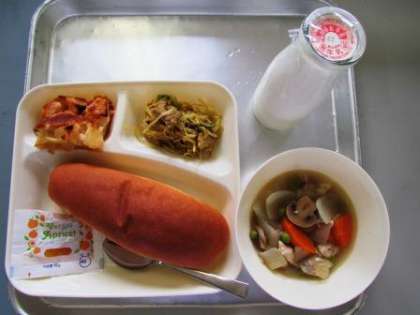 6月17日の給食は、鶏肉と野菜のスープ煮、カレーソテー、りんごの