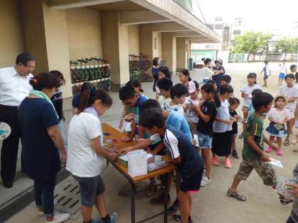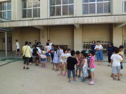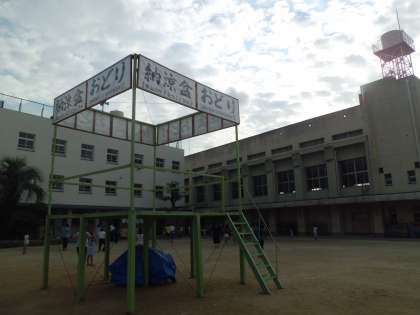 ラジオ体操が終わるとカードに好きなハンコを選んで押します。初日、少し人数が少なかったようです。たくさんの参加をお待ちしています。地域の盆踊りも27日(金)・28日(土)にあります。運動場にも大きな櫓が立ち始めました。