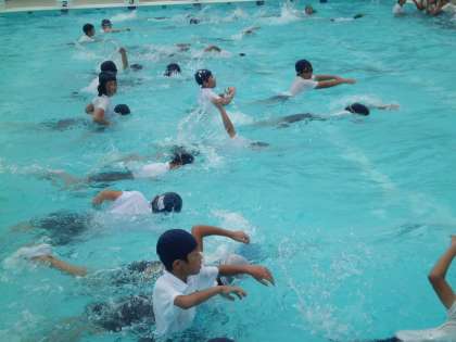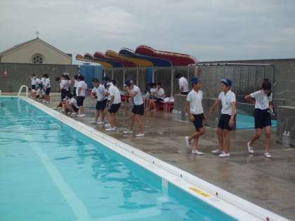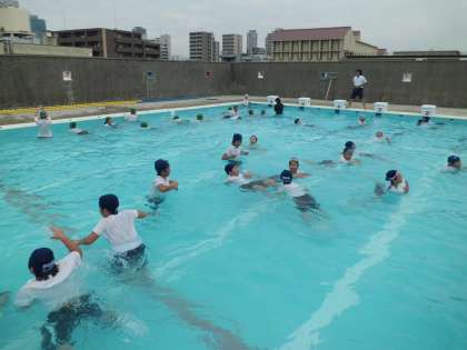 7月2日(火)服を着たままプールの中に入り、泳ぎにくさを体感しました。上靴も履いています。ペットボトル1本でも結構浮くことを知りました。とっさの時にどうしたらよいか学ぶことができました。(プールの水は今日入れ替えます)