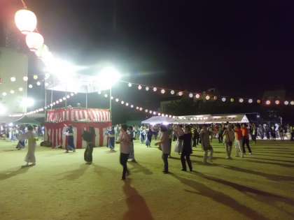 本日27日(金)、勝山小学校の校庭で盆踊りが行われました。本来は、今日と明日の二日間の開催予定でしたが、台風が近づいているので本日のみとなりました。いろんな音頭が流れる中、会ごとにお揃いの衣装で楽しく、ステキに踊られていました。