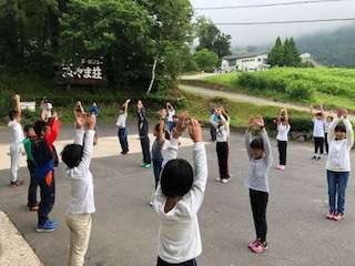 2日目の朝、みんなよく寝たようで、元気に集会ができました。なんとか今日一日天気も持ちそ