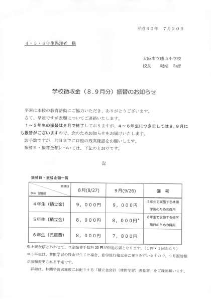 4〜6年生につきましては8.9月にも学校徴収金(児童費・積立金)の振替がございます。
