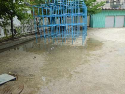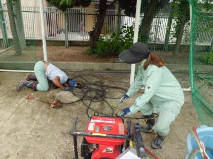 職員室前の花壇には、地域の方からいただいたマリーゴールドがきれいに咲いています。さて、学校ではいろいろなことが起こります。プールの水を排水するとジャングルジム付近のマンホールから、水があふれるようになりました。排水管がつまっていました。管理作業員さんに機械を使って通す作業をしてもらっています。なかなか時間がかかります。