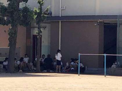 今日のお昼は遠足気分を味わうために4年生は運動場で食べていました。まだ、台風の余波で風が吹いていましたが、楽しそうでした。