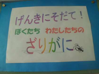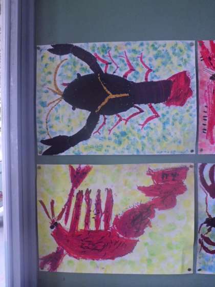 玄関を入って右側の掲示板は現在、2年生の作品が掲示されています。「げんきにそだて!ぼくたち わたしたちの ざりがに」です。来校された時にご覧ください。