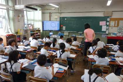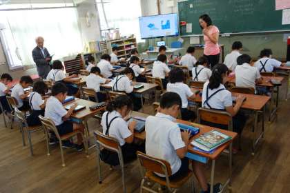 前半は教科書と電子黒板を使って一つの辺から三角形、四角形を作りました。みんな上手にそれぞれの図形を描きました。