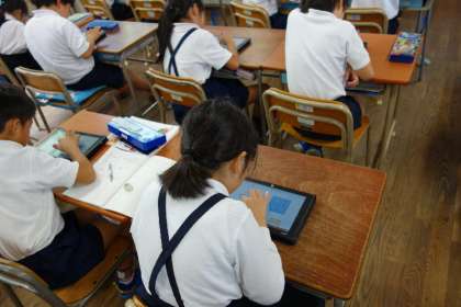後半はタブレットを使って、三角形を二つ使って三角形をつくるミッションや四角形をつくるミッションに取り組んでいました。図形を動かしたり回したりしてうまく引っ付けるのが少し難しく、手こずっていましたが、慣れてくると、どんどん三角形、四角形を作っていました。