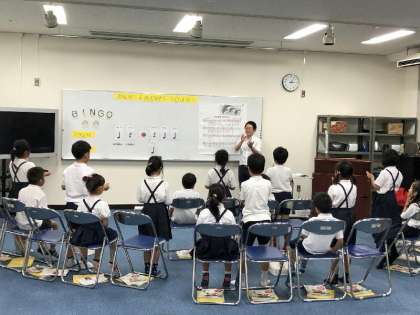 多目的室で、ちょっと慣れない3拍子のリズムについての学習を行いました。みんなとても楽しく取り組んで、はじめての3拍子もばっちりでした。
