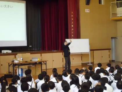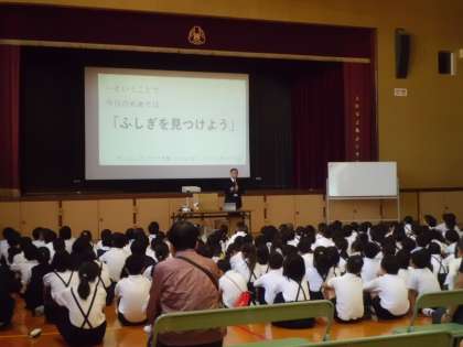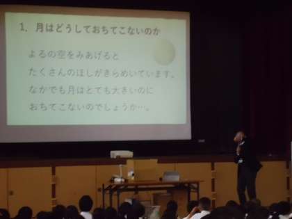1時間目は、講堂で校長先生による「うちゅうのふしぎ」の授業でした。「月はなぜ落ちてこないのか」??とか太陽よりも大きな星があることも知りました。ふしぎふしぎのお話でした。