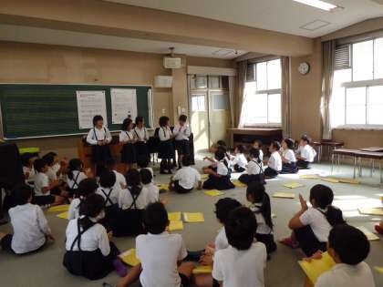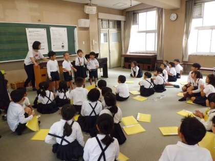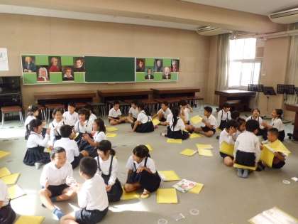 1・2組で音楽をしました。リズムに合わせて、自分の名前を言います。グループの友だちとリズムを意識して、つなげていきました。みんな、なかなかのリズム感でした。