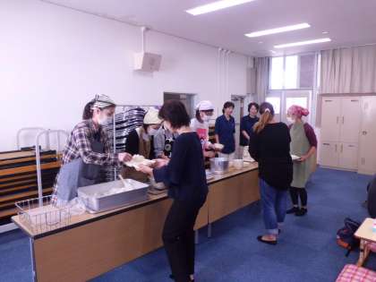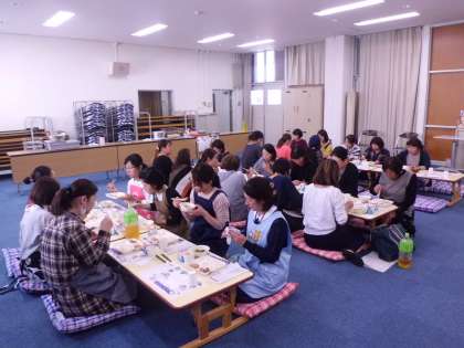 いよいよ試食タイムです。お母さん方で協力して、配膳します。ご感想は?「おいしいです。」をいたたきました。おうちでも、子どもたちと給食のことを話してみてください。
