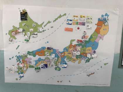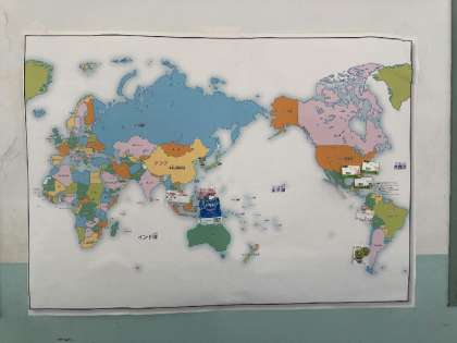 3年生の教室の廊下に日本地図と世界地図が貼ってあり、そこに何か貼ってありました。