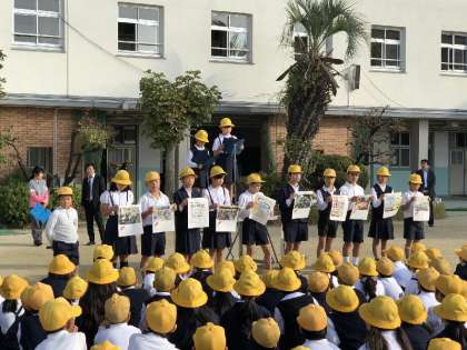 5日の全校朝会で、児童会の皆さんから赤い羽根共同募金についてのお話がありました。