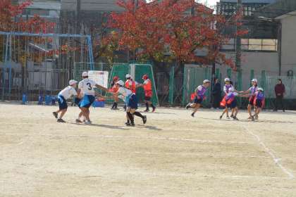 6年生は晴天の中、運動場でタグラグビーの練習。はね方が変わるアーモンド形のボールの扱い方や、相手を出し抜く作戦会議などこのところいろいろと練習を重ねてきました。